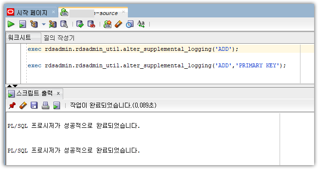 위 문서에 안내된 쿼리를 2번까지 실행하여 보충 로깅을 설정하였습니다.