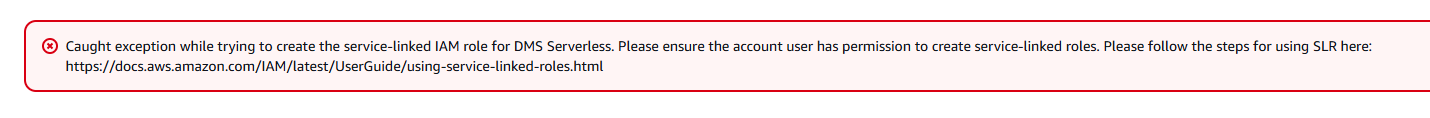 IAM:CreateServiceLinkedRole 권한이 없어서 발생한 이슈 (이 이슈는 IAM:CreateServiceLinkedRole 권한이 있는 계정으로 단 한 번이라도 서버리스 복제를 생성했다면 발생하지 않습니다.)