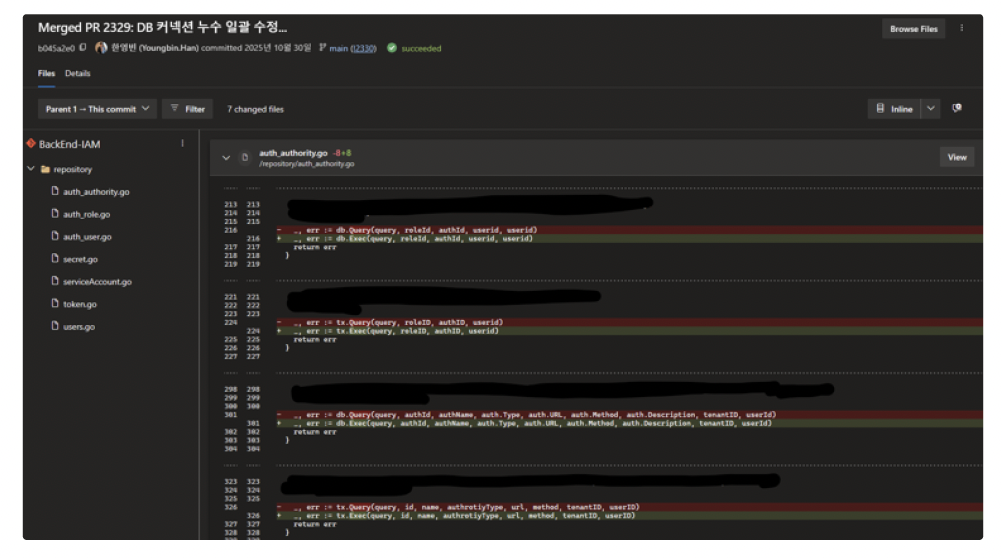 return nil이 문제를 해결하기 위해 쿼리 결과 반환이 필요 없거나 사용하지 않는 모든 작업은 커넥션을 즉시 반환하는 db.Exec 방식으로 수정했습니다. 이 과정에서 GitHub Copilot과 같은 생성형 AI 도구를 활용하여 프로젝트 전체 소스 코드에서 동일한 패턴을 찾아 수정함으로써 작업 효율을 극대화할 수 있었습니다.