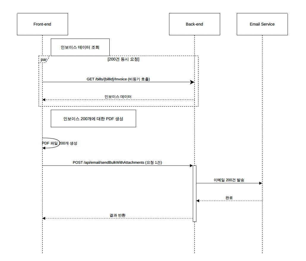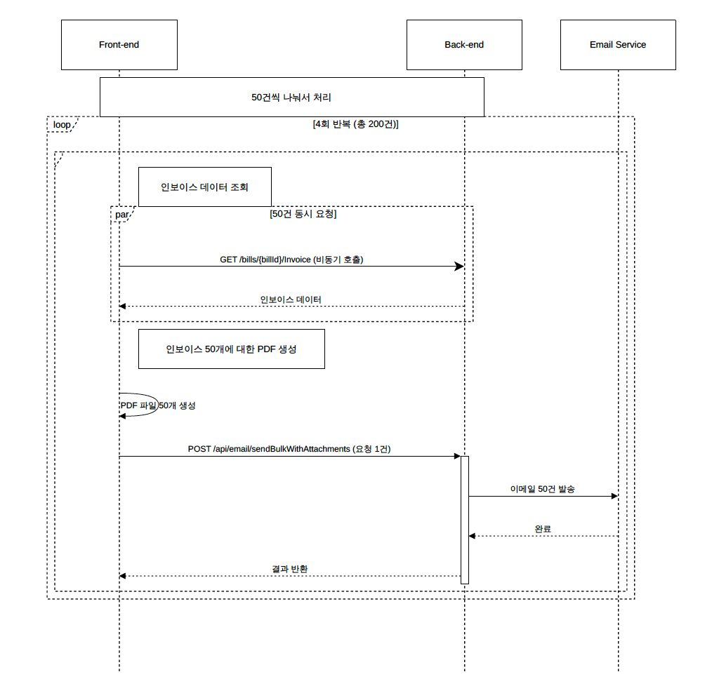 생각해 보면 매달 인보이스 발송 시 발생하는 이러한 문제를 해결하기 위해서는 인보이스 생성 및 발송 로직 전반을 수정하여 다른 방식으로 다시 구현하는 것이 가장 좋은 방법일 수도 있습니다. 현재는 프론트엔드에서 약 200건의 인보이스를 각 건별로 호출하는 작업을 한 번에 수행하고 각 PDF를 생성한 뒤 다시 백엔드 API를 호출하며 파일들을 전달하는 형태입니다.