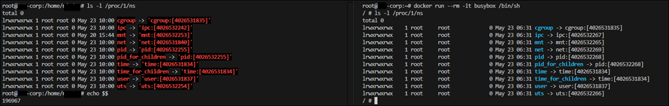 ==> 위의 과정을 통해 호스트에서는 새로운 쉘을 실행하여도, Init Process와 NS ID가 달라지지 않는 점을 확인 가능합니다.