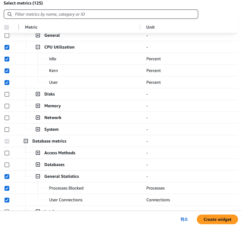 아래와 같이 지표를 선택해서 위젯을 생성하면, 여러 개의 지표를 가진 하나의 위젯이 생성됩니다.