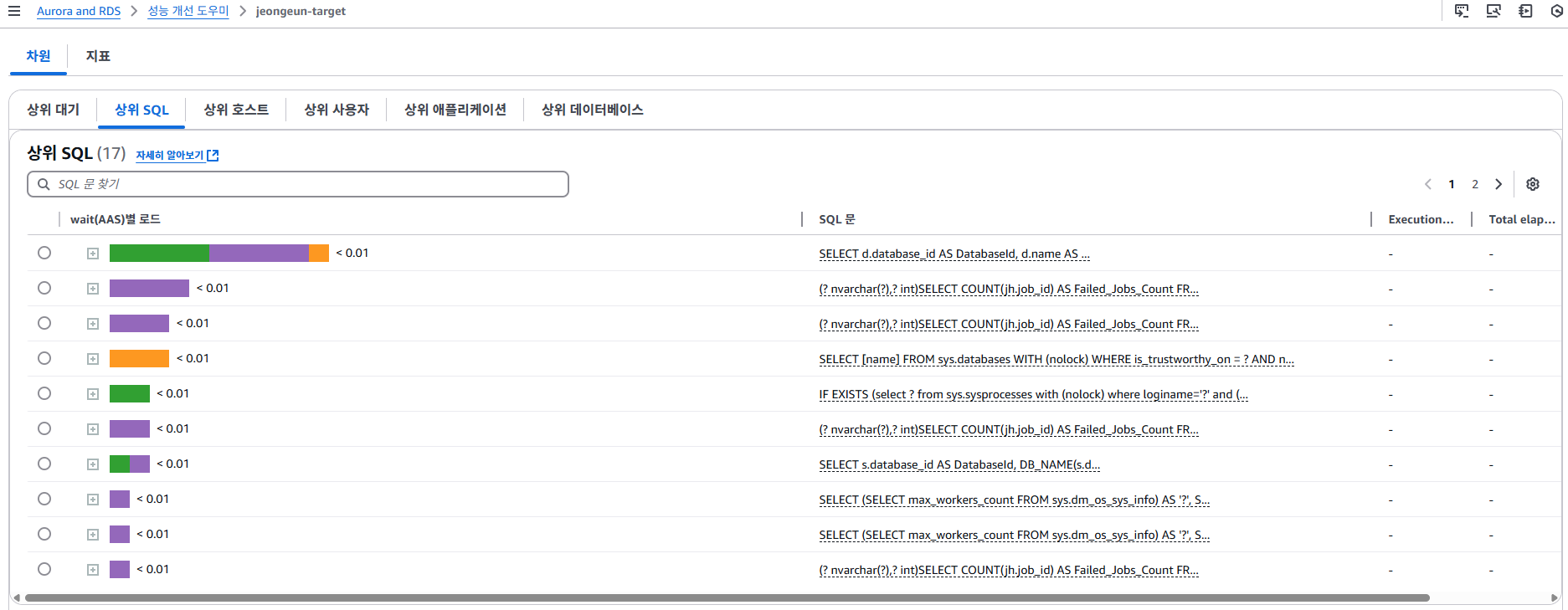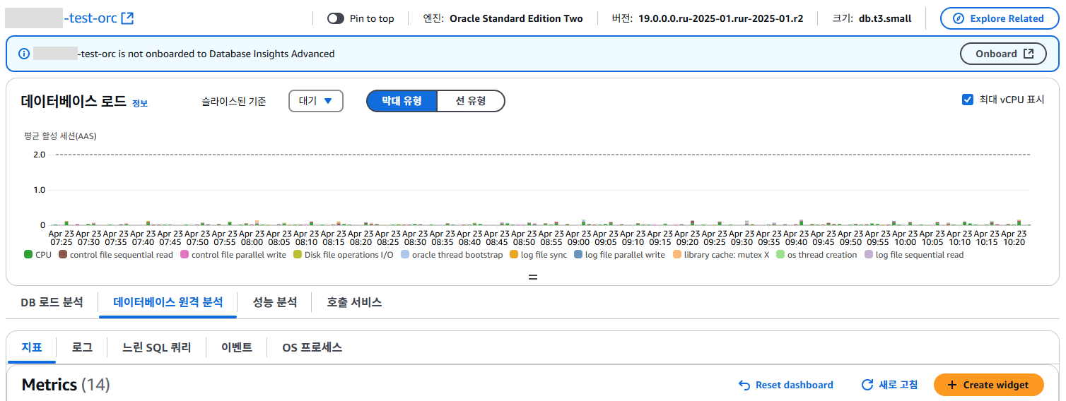 DB 로드 분석은 상위 SQL, 상위 대기, 상위 호스트 등등.. Performance Insights(성능 개선 도우미)에서 확인할 수 있는 테이블들을 Database Insights에서 확인할 수 있습니다.