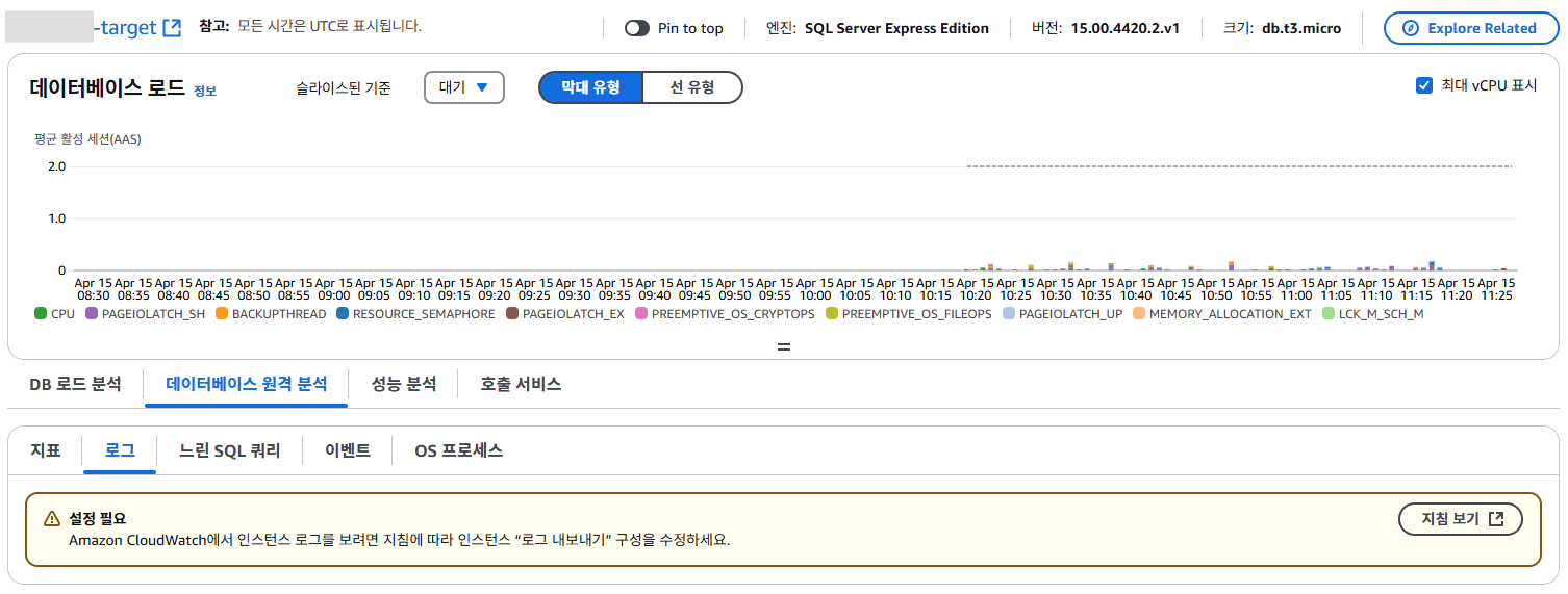 Database Insights에서 로그도 확인할 수 있는데, 로그를 확인하려면, RDS에서 로그 내보내기를 해야 확인할 수 있습니다. 그렇지 않으면 아래와 같이 설정 필요하다는 안내가 표시됩니다.