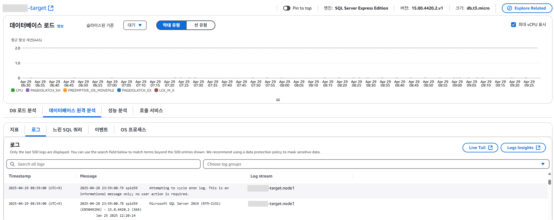 데이터베이스의 지표나 로그, 느린 쿼리 로그, 이벤트, OS 프로세스를 확인할 수 있는 탭 입니다.