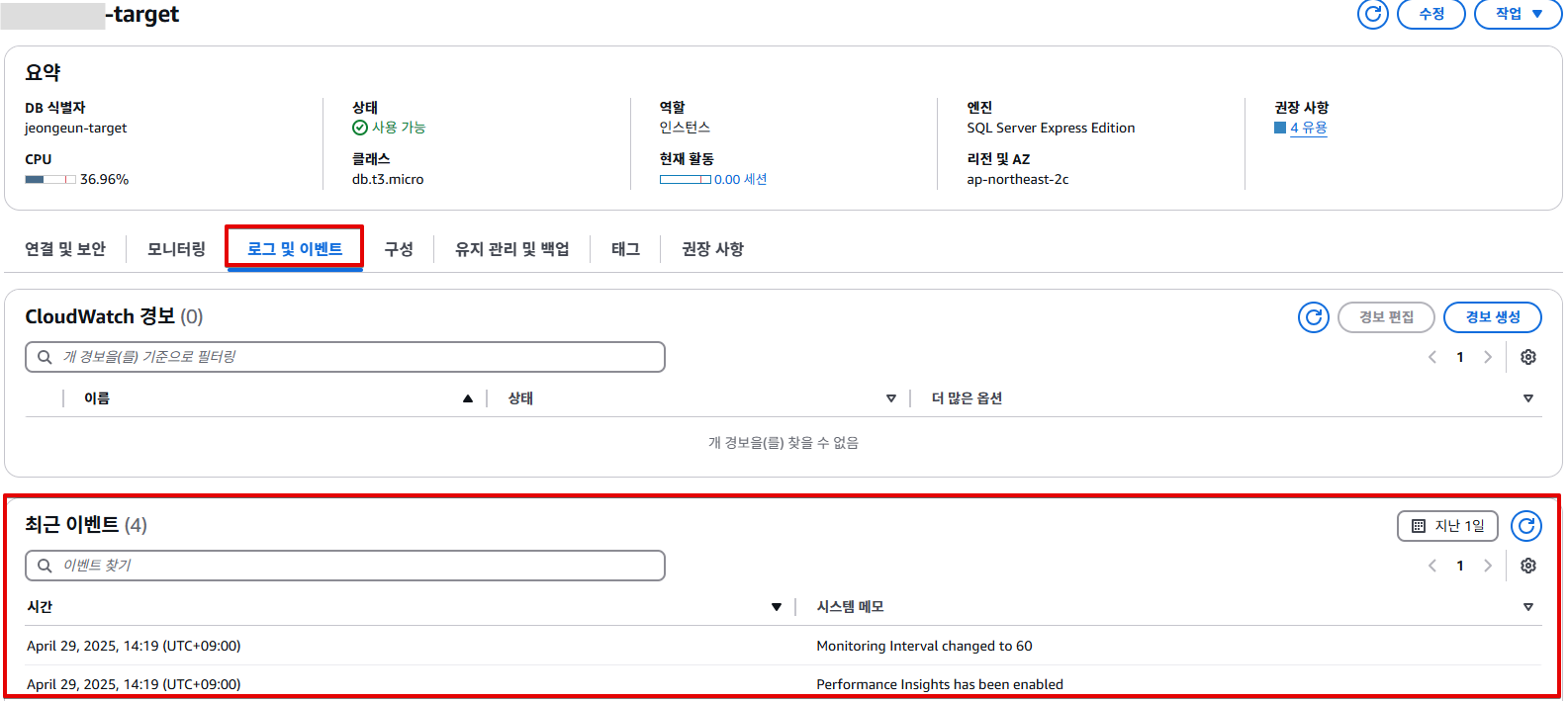 RDS 콘솔에서 DB인스턴스 세부 정보 - 로그 및 이벤트의 최근 이벤트에 표시되는 내용을, 이벤트 탭에서 확인할 수 있습니다.