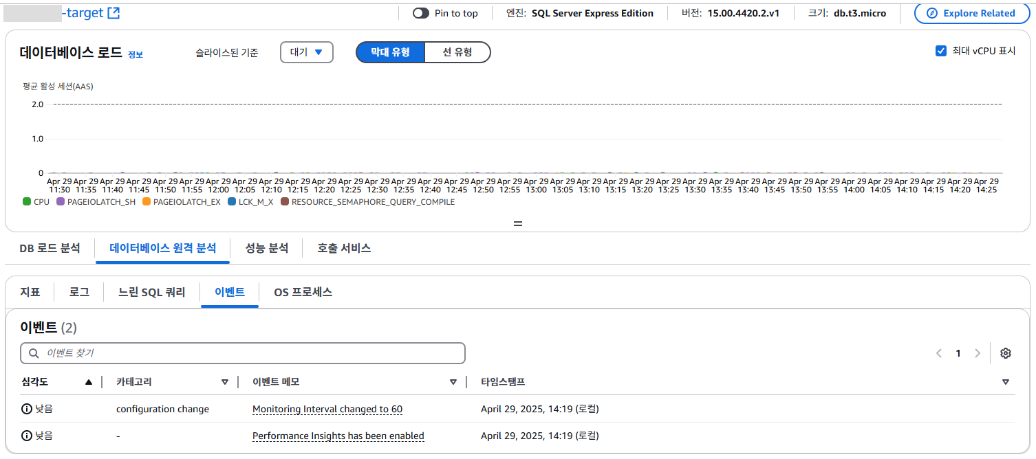 예시) t3.micro를 사용하는 SQL Server에서 Database Insights 유료 티어를 2주간 활성화 시켰을 때 비용