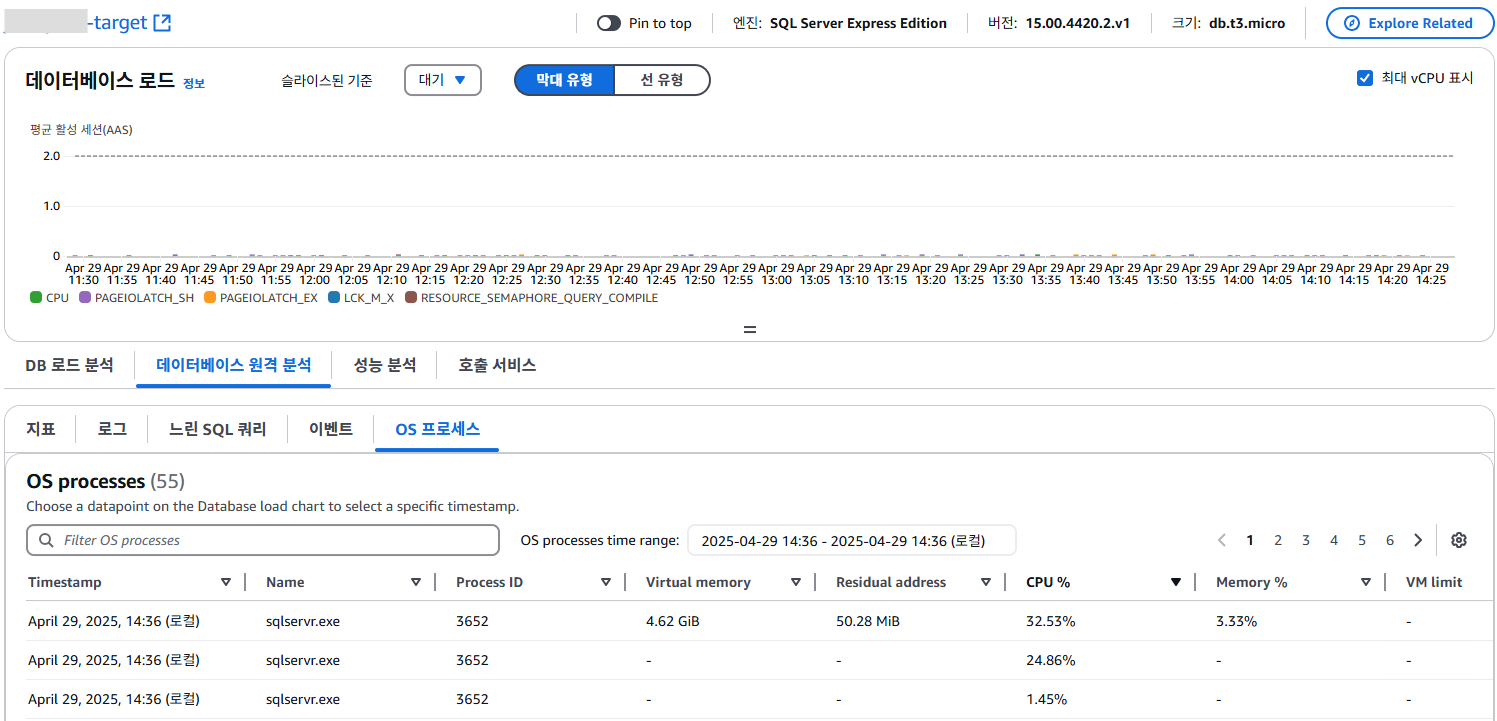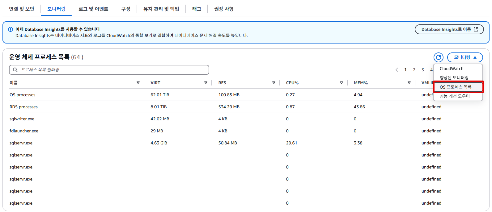 RDS 콘솔에서 DB인스턴스 세부 정보 - 모니터링 - OS 프로세스 목록에 표시되는 내용을 OS 프로세스 탭에서 확인할 수 있습니다.