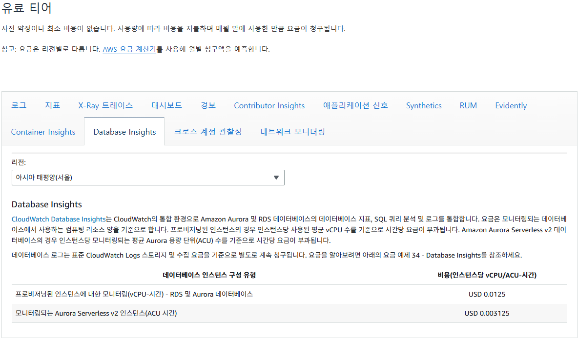 Database Insights 유료 티어(Advanced)를 활성화하면 Performance Insights의 보존 기간이 15개월로 늘어나게 되는데, 이 비용은 추가되지 않고, 유료 티어 비용만 발생합니다.