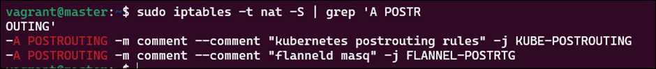 sudo iptables -t nat -S | grep 'A POSTROUTING' #외부 통신 식별 시, CIDR 값과 같은 별다른 정보 안보이며, "FLANNEL-POSTRTG"와 같은 라우팅 체인만 존재함