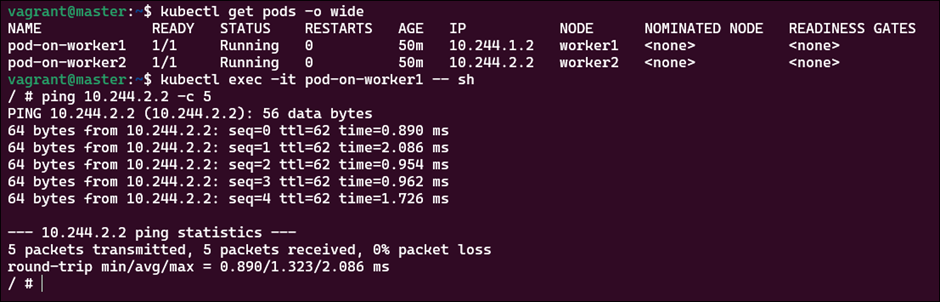 여기서 "onlink"는 직접 연결된 것처럼 취급한다라는 의미로 vxlan 구조 방식의 일반적인 설정입니다.노드간 통신 검증은 여러 방식이 있을 수 있겠으나, Worker1에 생성된 Pod에 접근하여, Worker2로 ping을 날리는 방식으로 검증하도록 하겠습니다.
