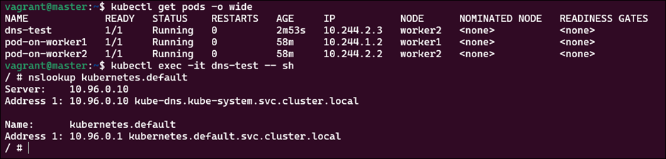 kubectl run dns-test --image=busybox:1.28 --rm -it --restart=Never – sh<결과>