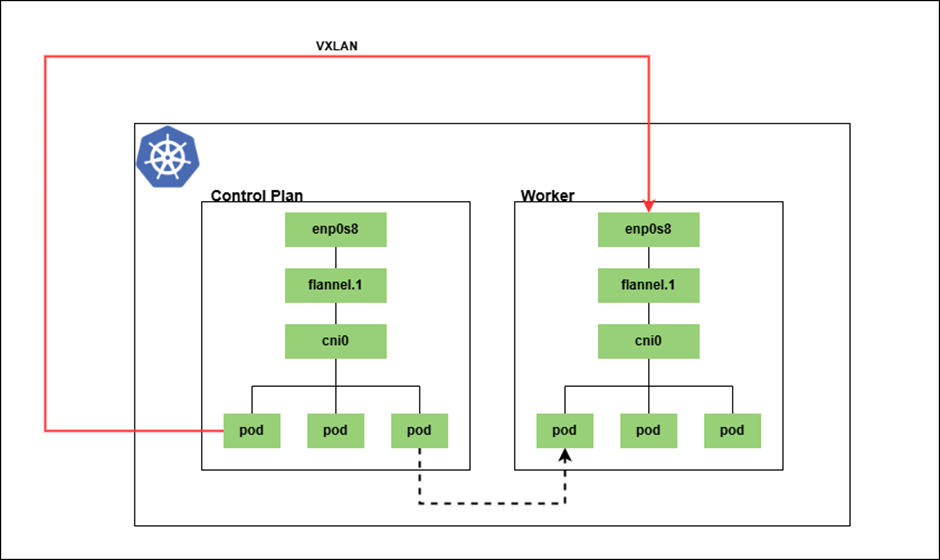 Flannel CNI는 flannel.1(vxlan) 인터페이스 및 cni0 인터페이스를 Master Node에 추가합니다.