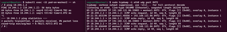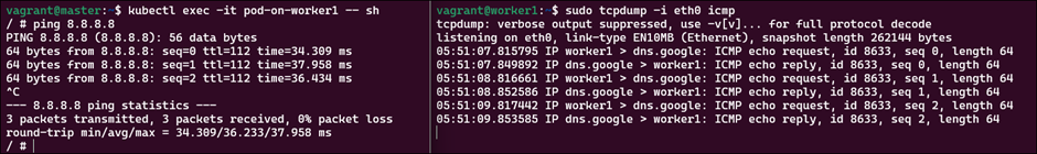-A FLANNEL-POSTRTG -s 10.244.0.0/16 ! -d 224.0.0.0/4 -j MASQUERADE실제 Worker1의 Pod Container 접근 후 외부로 ping 테스트 시, 정상적으로 통신이 됩니다. 또한, tcpdump를 통해 Pod가 eth0 인터페이스를 통해 외부로 패킷을 전달하는 것을 확인 가능합니다.