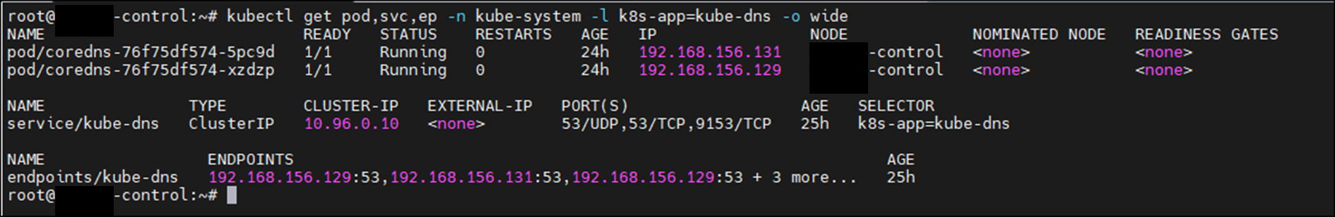 kubectl get pod,svc,ep -n kube-system -l k8s-app=kube-dns -o wide