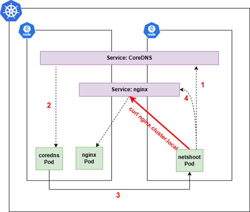 예를 들어, curl http://nginx 인 경우 아래와 같은 순서로 조회하며, 조회된 DNS 명이 ClusterIP로 resolve됩니다.