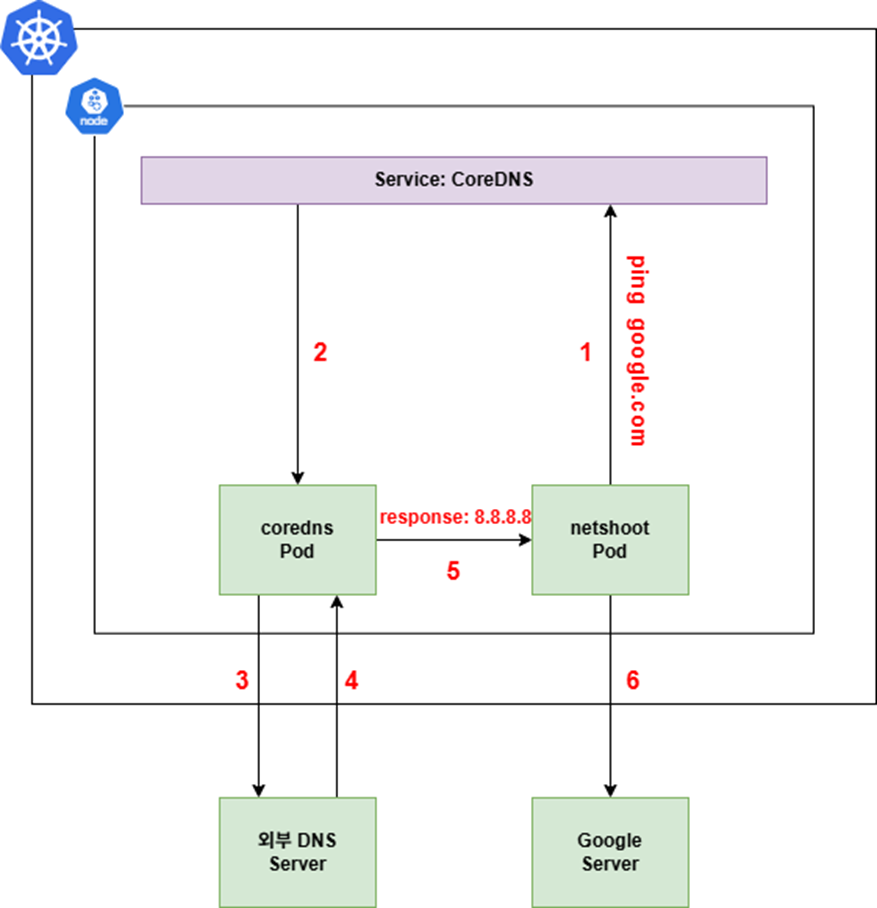 즉, Pod 내부에서의 모든 DNS 요청은 해당 ClusterIP로 전달되고, 이 IP는 실제로 CoreDNS가 백엔드단에서 처리합니다.