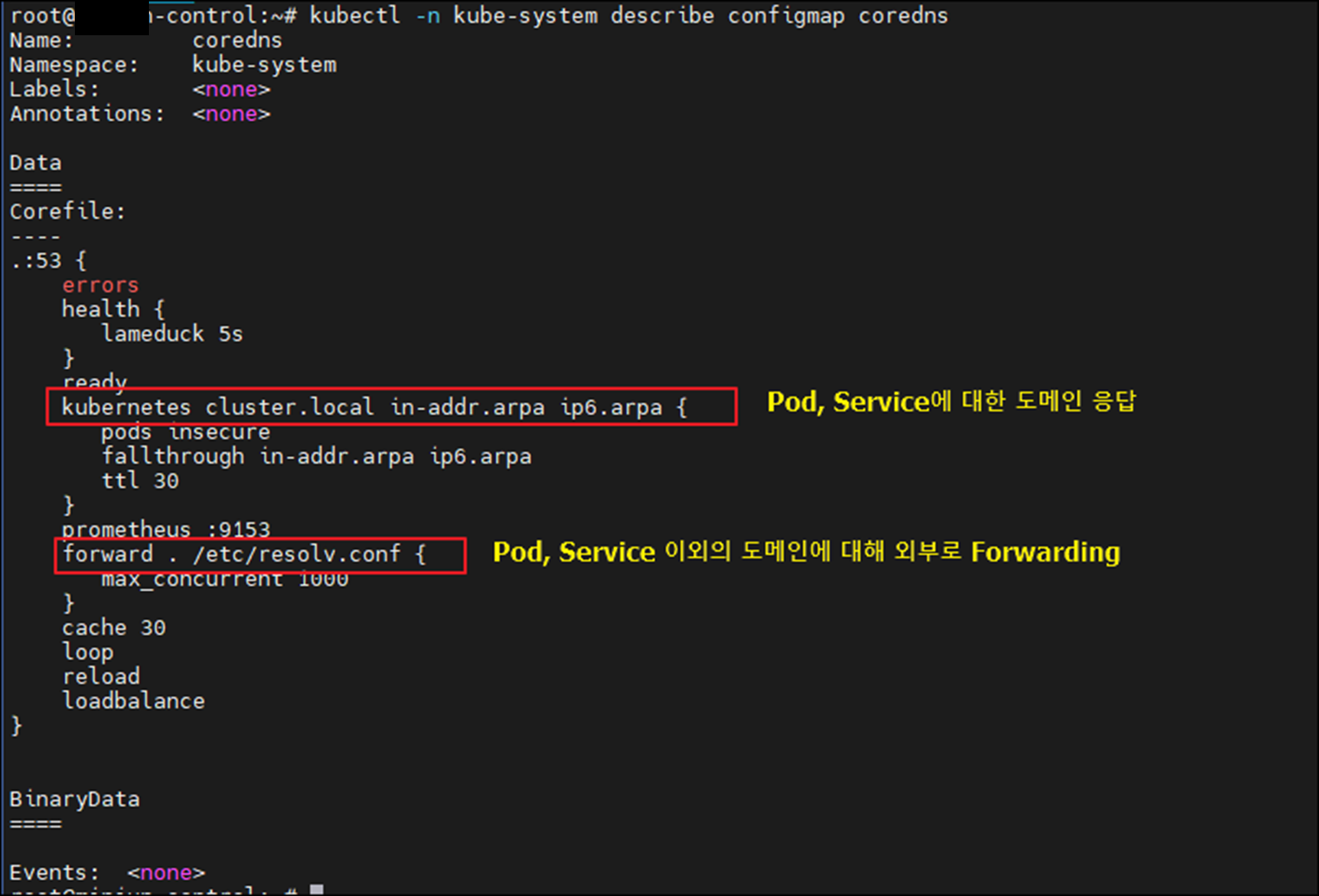 CoreDNS는 내부 DNS 요청만 처리하는 것이 아닌, 외부 DNS 요청도 forward 플러그인을 통해 처리할 수 있도록 설정되어 있음