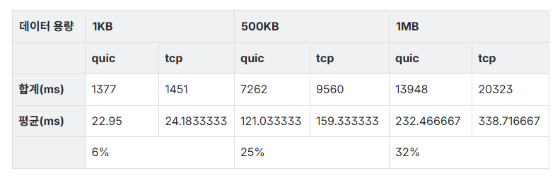 데이터의 용량이 클수록 TCP 통신보다 QUIC 통신이 빠른 것을 알 수 있습니다.