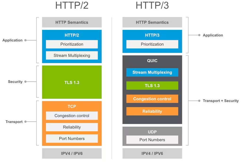 기존 TCP 위에서 동작하는 HTTP/1.1, HTTP/2와는 달리, QUIC 은 UDP 기반으로 설계되었으며, 이를 통해 연결 지연을 최소하고 네트워크 성능을 크게 개선하는 것을 목표로 합니다.